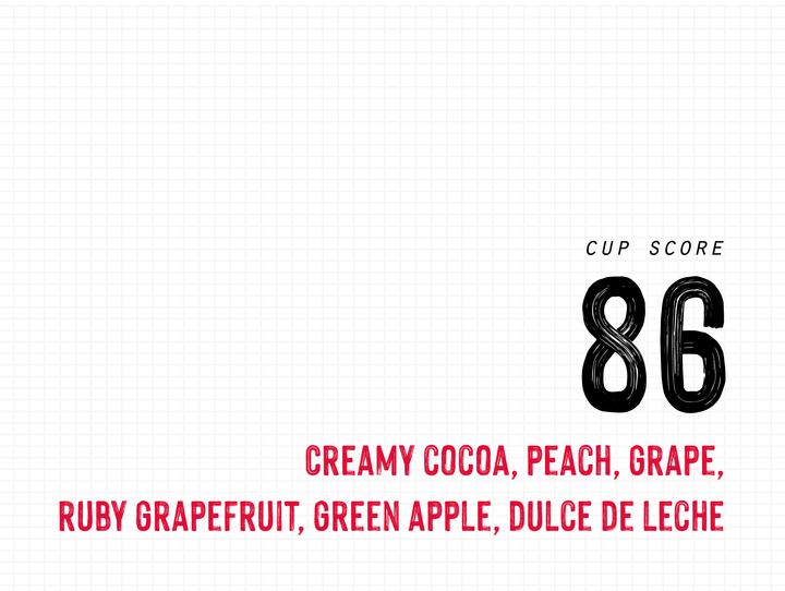Creamy cocoa, peach, ruby grapefruit, green apple, grape, dulce de leche